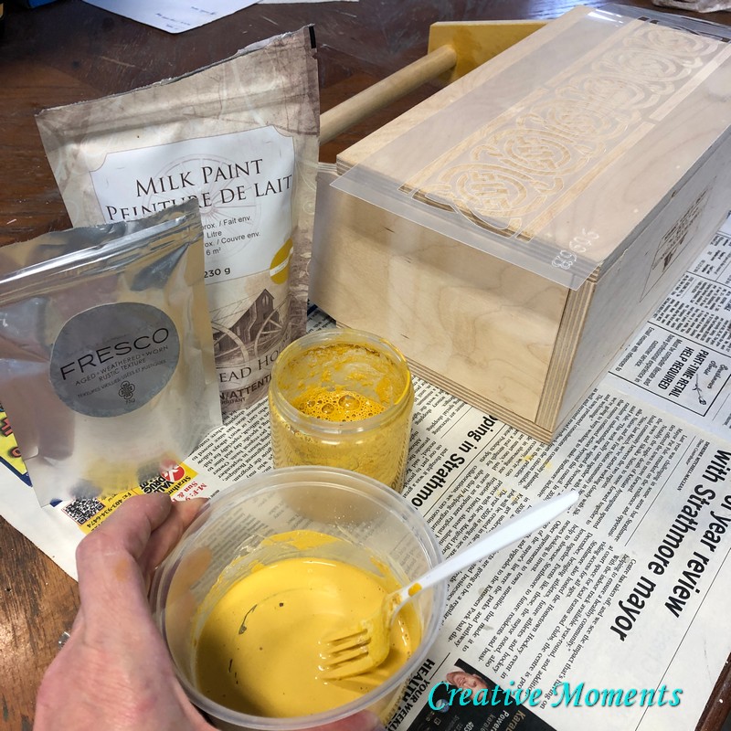 Then the stencil was carefully lifted to reveal the design and left to dry overnight before repeating on the other side and ends.