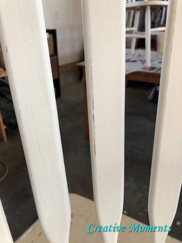 I like to add minimal distressing to most pieces. It gives the piece character especially when farmhouse is the goal and it makes that first ding or scratch a bit easier to take. Two coats of the warm white paint also allows for a worn aged feel. Chairs get allot of wear and tear. I also use the sanding sponge all over to smooth the paint making it feel like butter.