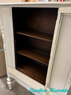 The ornate fretwork was painted the soft yellow white with the wider Dixie Belle Artist Brush on both sides. I set it in the cabinet to show the customer when dry. The dark interior pops the fretwork perfectly.