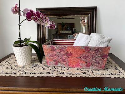 Native rose rice decoupage paper is so pretty and paired perfectly with the box color. Pieces were cut to fit the sides then decopauged onto the basket using  Terra Seal as the adhesive brushed under and over the paper. Terra seal is matte.
