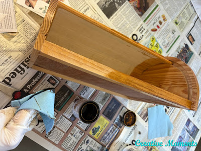 Transfers are best sealed to protect them, especially since this piece may be wiped being used in a kitchen. I used a 2" synthetic brush to apply satin clear coat. Two coats were applied all over all sides.